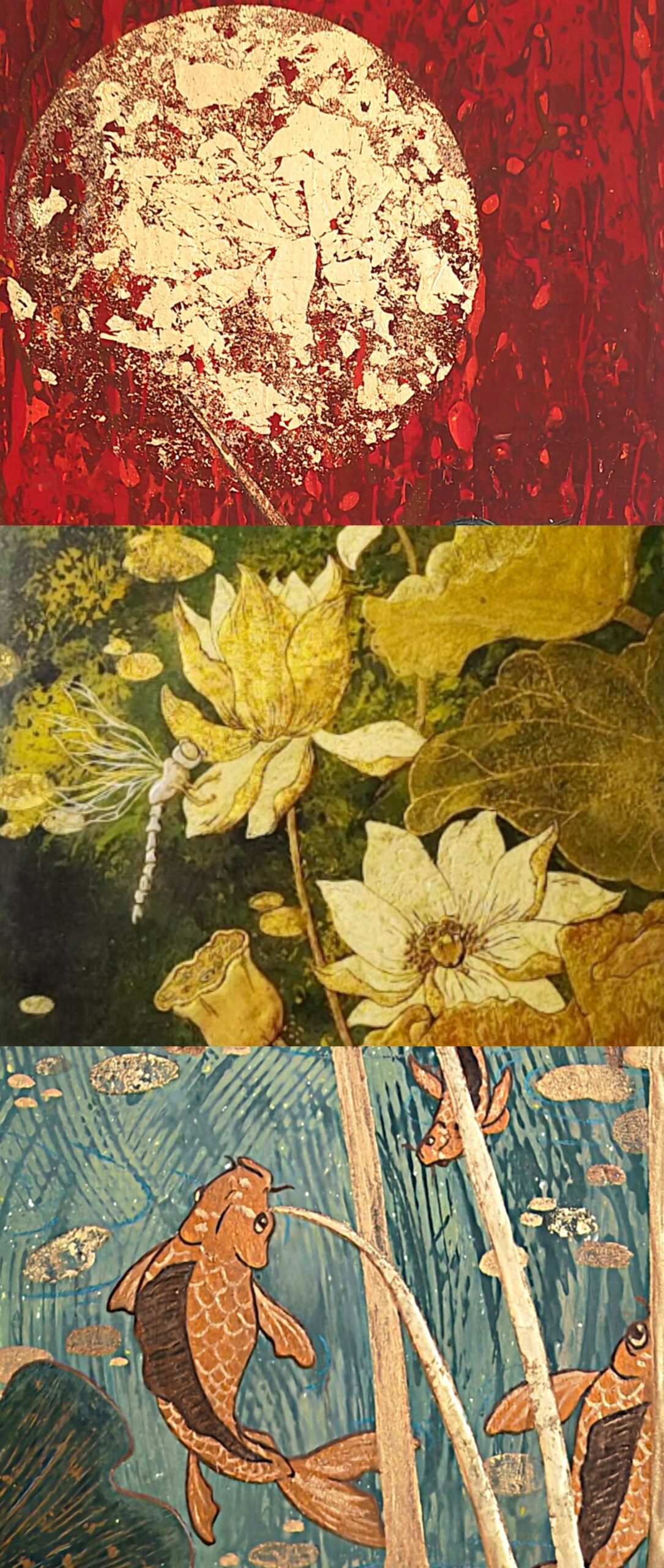 Les pigments me permettent de composer des fonds animés de mouvements subtils, de jeux de profondeur, qui deviennent le théâtre d’un univers végétal et animal. Fleurs, oiseaux, papillons, poissons et plantes y prennent vie. À travers mes panneaux, je cherche à capturer une émotion, une atmosphère poétique avec l’aide de matériaux nobles, feuilles d’or, de cuivre, poudres métallique, nacres…